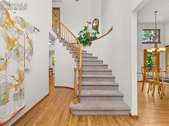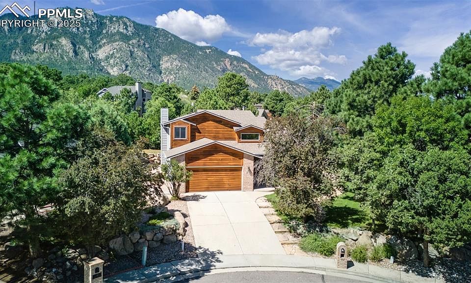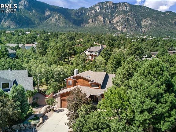 Tucked away at the end of a quiet cul-de-sac in the desirable Neal Ranch community of Broadmoor Bluffs, this spacious 4-bedroom, 4-bathroom home offers over 4,000 square feet of refined living space, set against the stunning natural backdrop of Cheyenne Mountain. Located in the award-winning School District 12, this home combines luxury, comfort, & functionality in one of Colorado Springs’ most sought-after neighborhoods. Rich wood flooring spans the main level, leading into a warm & inviting family room accented by a new stone fireplace facade with a custom wood mantle. Bordering the fireplace are built-in bookcases with glass shelving, accent lighting, & lower cabinetry—a perfect blend of style & storage. The heart of the home is a designer kitchen, featuring ceiling-height cherry shaker cabinets, quartz white vein countertops & backsplash, SS appliances, & a gas oven—ideal for both everyday meals & entertaining. The oversized custom den is a highlight, showcasing a wall-to-wall built-in bookcase and cabinetry that seamlessly transitions into a corner workstation with extended storage. Upstairs is the oversized primary suite- bay windows provide an abundance of natural light and breathtaking scenic views. Relax and refresh in the private full 5-piece bath with jetted tub. Two additional bedrooms, as well as, a full guest bath complete the upper level. The basement provides an additional living area, with built-in bookshelves, an expansive guest bedroom and 3/4 bathroom. Storage won't be an issue, with multiple areas to accommodate your seasonal items. Step outside to a true Colorado oasis. The enormous composite deck with modern black metal railing offers a front-row seat to panoramic mountain views and local wildlife, while custom landscaping enhances both curb appeal and outdoor enjoyment. Class 4 impact-resistant roof (2020). This home is a rare blend of elegance, function, and location. Don’t miss your chance to experience the best of Broadmoor Bluffs living!