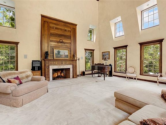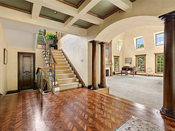 ROOM FOR A POOL! Modern Mediterranean style 5,000 SqFt home with pristine attention to detail and quality throughout. The formal entry foyer greets with graceful columns, coffered ceilings, ornate trim woodwork and chevron patterned hardwood floors. Relax and enjoy entertaining in a stately 30x30 living room with 30 foot vaulted ceilings and an oversized lodge-like grand mantle fireplace. The dining room easily seats 10 and through a wall of glass doors enjoy indoor-outdoor living and calming views of the stone patio and park-like grounds. A sunny eat-in-kitchen features double sinks, double Bosch ovens, an integrated wine fridge and a center island with Bosch 5 burner gas cooktop and seating for four. Work from home in the executive office detailed with ornate wainscoting and built-ins, a stone facade fireplace and guest bath. Also located on he main level are the Guest Bedroom suite with full bath and kitchen pantry. Upstairs are 3bedrooms including a large master bedroom suite with walk out terrace, fireplace, a formal sitting area and decadent 5 fixture en-suite master bath fitted with steam shower, jacuzzi soaking bathtub and his and her sinks. The his and hers master bedroom walk-in closet is fitted with a washer and dryer. Arrive home at ease with the ample sized driveway and heated 4 car garage with direct access to a mudroom/storage room and finished basement leading to the kitchen from an internal staircase. Located on a low trafficked dirt road just East of Route 9D in prime Garrison. This gently sloping park-like 2 acre corner parcel has mature trees, a charming country stream, multiple sitting areas and and outdoor stone fireplace. Easily raise chickens and grow vegetables with the flexible landscape with bonus outbuilding and groundskeeping shed. Just 50 miles North of NYC and only a 8 minute drive to the Garrison train station which offers a 1 Hour ride to Grand Central.
