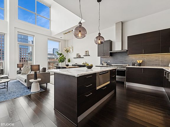 Enjoy elegant appointments and modern finishes in this 3 bedroom, 3 bath, 1950 SQFT penthouse with over 550 SQFT of private roof deck space! The elevator opens directly into the residence, immediately welcoming you home. A dramatic two-story living room has enormous floor-to-ceiling windows showcasing views of Willis Tower and the West Loop. Flooded with natural light, the open floor plan lends itself well to entertaining and allows the rooms to flow together seamlessly. Sleek and modern, the kitchen features dark cabinetry, recently resurfaced marble countertops, Fischer & Paykel and Bosch appliances, and a center island with breakfast bar. A large balcony off the living space is the ideal place to dine al fresco and enjoy the views. A built-in office nook with newer shelving & Fornasetti wallpaper provides ample space to work from home without occupying a whole bedroom with office space. The serene primary suite has ample natural light from large windows, a private balcony, automated black-out shades, a recently renovated walk-in closet, and a luxurious ensuite bath with an oversized shower, double sinks, and a brand-new Toto Washlet toilet. Graciously sized, the second and third bedrooms each enjoy newly renovated closet space and ensuite baths. This unit has additional storage closet space and a laundry closet with LG W/D. A private roof deck with gorgeous skyline views is the perfect place to entertain and relax. 2-car tandem parking included in the list price. Ideally located in the West Loop, walk to world-class restaurants, West Loop Farmer's Market, multiple gyms, Whole Foods, Mariano's, parks, playgrounds, daycare options, Skinner Elementary School and easy access to the Loop, 290, and public transportation. Welcome home!