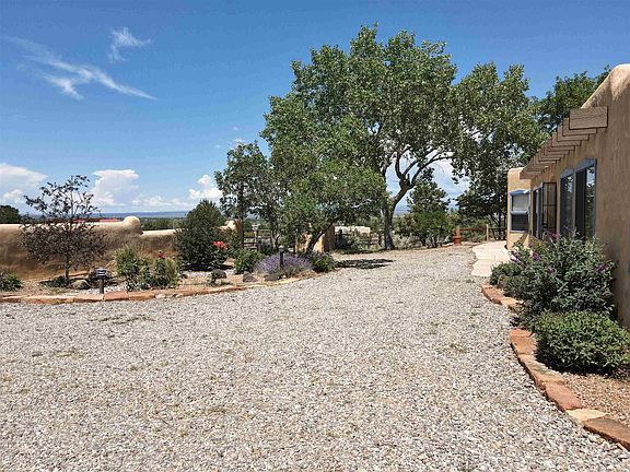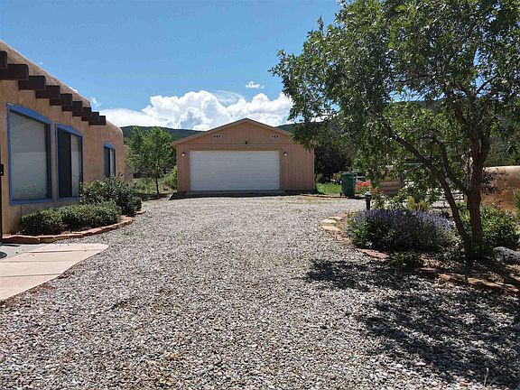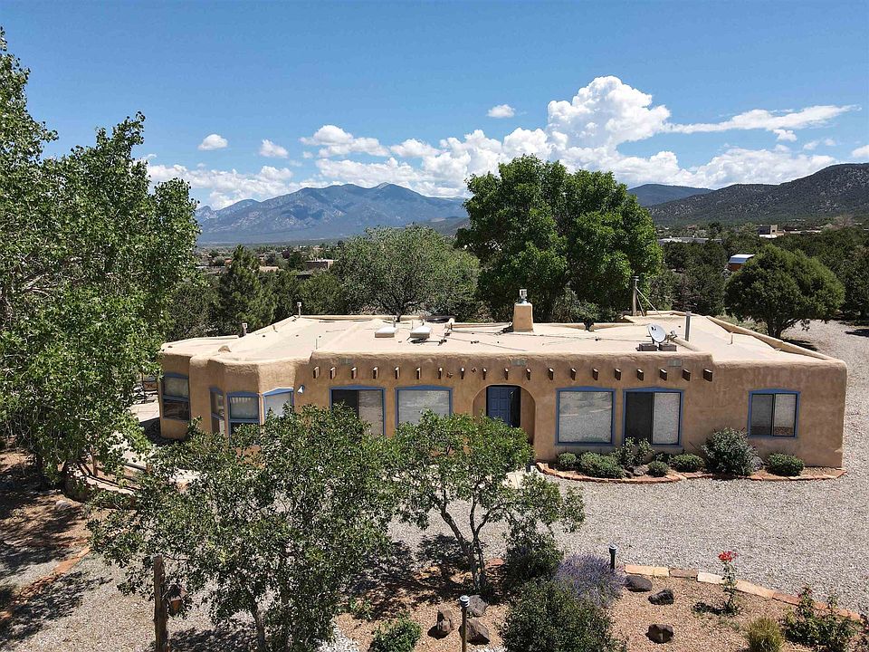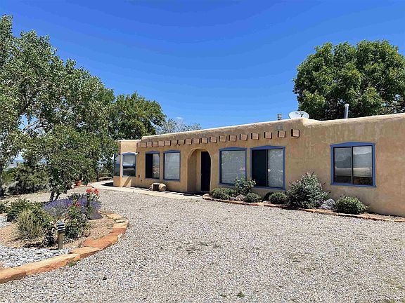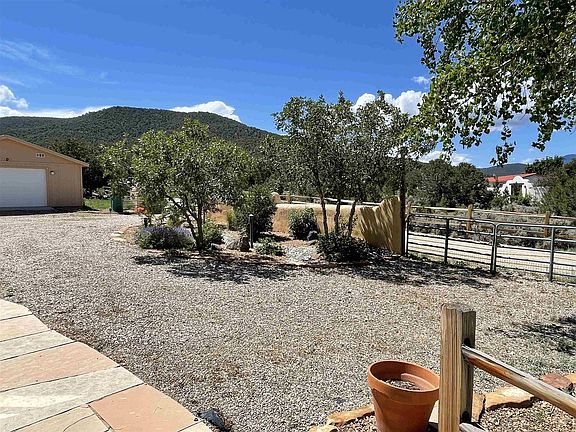 The stunning 360-degree views from this charming Talpa Foothills location are mesmerizing! Renovated in 2019, this three-bedroom and two-bath, 1,866-square-feet split-bedroom floorplan with two living spaces is oriented toward the famous mountain and sunset views found only in the foothills of the Sangre de Christo Mountains. Large kitchen has cherry cabinets, stainless steel appliances, granite countertops, large double pantry, and a skylight and center island with spacious storage. Renovated master bathroom has large shower and a courtyard window. Third bedroom has separate entrance, which would be great for a vacation rental, separate studio or caretaker's separate living area. Large living area with wood beams and separate dining area provides a lovely vantage point to enjoy the gardens. The entire 2-acre property is fenced, gated, and landscaped with a breathtaking array of mature pinon, aspen, and pine. The newly installed large Arizona flagstone courtyard is perfect for entertaining or simply relaxing under the starlit sky. Outdoor spaces abound including a koi pond, another flagstone patio with latilla fencing, and greenhouse with its own water, electric, propane and auto thermostat for control. The horse property also has a two-horse-stall building and riding ring in addition to a separate storage shed, and oversized two-car garage with large storage area. Well-maintained gravel circular driveway allows allows for easy access in and out of the property.