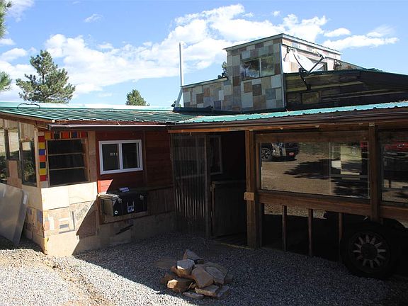 An artistic escape from the ordinary. 1.26 beautiful rolling acres with Angel Fire Ski mountain views and open rolling terrain with a freckling of pines. This home has been entirely constructed from reclaimed materials and lumber. A spacious living area that opens to the dining room and kitchen with custom tile work, custom wood cabinetry, slate floors and tall ceilings. Open the front door to an expansive covered deck that looks out over gorgeous mountain landscape. A great loft for the kiddos connects bedrooms which are roomy and offer options of creating an office or craft/art space. The home shares a private well with 6 other owners but only 4 are actively using the water. The well has gone through an overhaul of sorts and now has a new pump, motor and wiring. 2 on demand water heaters, and a seasonal pond that catches run off when we have abundant moisture. Home has a brand new septic system installed September 2018