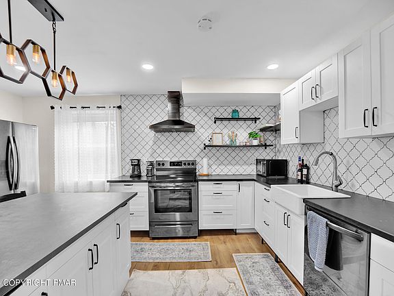 Step inside to discover a bright, open-concept main level with sleek hard-surface flooring that flows effortlessly through the living and dining areas. The stunning modern kitchen serves as the heart of the home, showcasing white cabinetry, striking black countertops, a center island, farmhouse sink, and stainless-steel range hood. The existing chimney is ready for a pellet or wood stove hookup, adding the perfect cozy touch for winter evenings in the mountains.