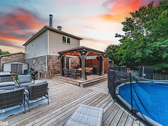FAMILY COMFORT, MODERN STYLE & A BACKYARD TO FALL IN LOVE WITH! This stunning all-brick two-storey home is nestled in a family-friendly neighbourhood on a quiet and safe street surrounded by great neighbours, with schools, shopping, entertainment, recreational activities, Highway 400 and the Barrie South GO Station just minutes away. A covered front porch and an interlock walkway lined with a garden bed create a warm welcome before stepping inside to a bright interior enhanced by modern paint tones, hardwood floors, two cozy fireplaces and pot lights. The kitchen is a true showstopper, showcasing white cabinetry with some glass inserts, stainless steel appliances and a timeless subway tile backsplash, while the family room offers a garden door walkout to the expansive backyard. Outdoors, this property shines with a spacious entertainer’s yard featuring an above-ground pool, a hard-top gazebo, a large deck and an impressive lot that stretches 209 feet on one side with plenty of grass space for kids and pets to enjoy - this backyard is absolutely stunning! Upstairs, three well-sized bedrooms provide comfortable retreats, including a generously sized primary with a sitting area, a four-piece ensuite and a closet with built-in shelving. The partially finished basement extends the living space with a recreation room that is perfect for movie nights, a 2-piece bath and plenty of storage. Everything you’ve been searching for in a #HomeToStay is right here, so stop scrolling and start packing!