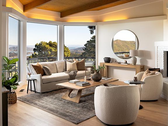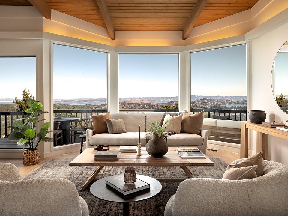 Embrace Mill Valley mountain living where wow is the first word visitors say. Perched at the top of the mountain, this reimagined mid-century home offers breathtaking 6-county views spanning Mt. Tam, Mill Valley, the Bay, three bridges, Mt. Diablo, and the city lights of San Francisco. Nearly every room features floor-to-ceiling windows framing ever-changing panoramas and endless natural light. Designed for easy entertaining and primarily single-level living, the open-concept layout connects the kitchen, dining area, great room, and family room, each with seamless indoor-outdoor flow to expansive redwood decks. The main level offers four bedrooms and three remodeled baths, including a secluded primary suite that opens to the view deck. Downstairs features a 350-bottle wine cellar and a flexible living room perfect for media, office, gym, or play. Outside, find a deer-fenced yard with level lawn, gardens, and room to play or grow. Enjoy city convenience and country serenity surrounded by trails, nature, and the close-knit Muir Woods Park community.