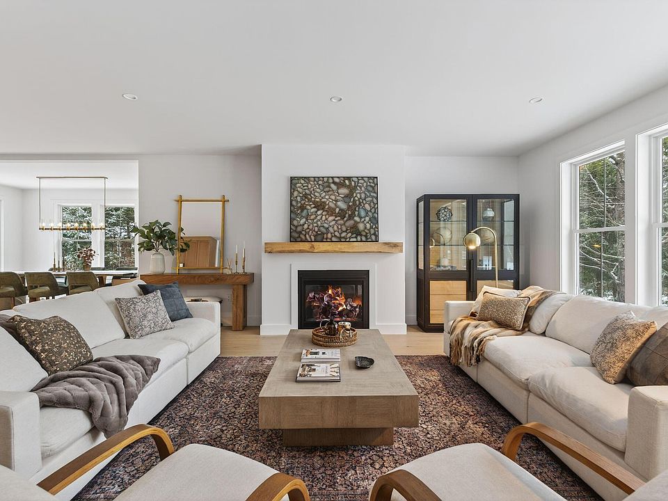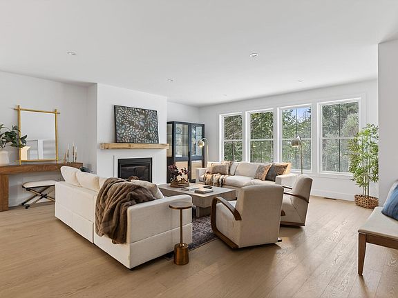 This stunning new home from Brush & Hammer Builders is newly completed! Don't miss your opportunity to move right into a custom retreat that blends clean, contemporary styling with timeless design. The exterior is richly layered with contrasting Hardie Plank and cedar shingle siding, complemented by gray-framed windows and standing-seam metal awnings, a modern take on classic New England materials. Inside, the wide-plank white oak floors, gas fireplace, and Taj Mahal quartzite counters curate a warm and elevated backdrop for everyday living. The kitchen truly shines, with a waterfall island, Thermador appliance suite, and enviable pantry. Open-concept living and dining spaces invite effortless entertaining, while a separate office offers privacy and purpose. Upstairs, a primary suite impresses with it's walk-ins - an oversized closet and beautiful marble shower. Three additional bedrooms share a cleverly designed bath, and a well-placed laundry room adds convenience. Downstairs, enjoy even more space with a large family room, a third full bathroom, and a separate room perfect for a home gym or hobby space. Privately sited on a wooded lot in a small neighborhood, this home is minutes to Falmouth's schools, The Woodlands Club, and shopping & restaurants.