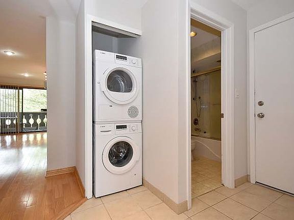 In-unit washer and dryerGranite kitchen countertopsWood cabinets