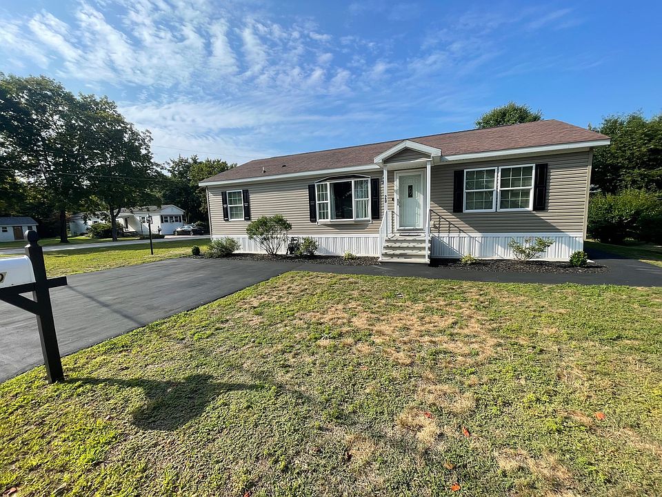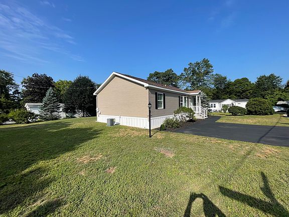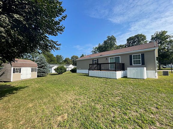 New listing at River Pines! Come see this 2012 28x48 home from Commodore. Lovingly cared for home that features an entertaining sized floor plan. Bay window sun splashed living room with wall to wall carpet and ceiling fan. Holiday gatherings will be a breeze. Vinyl floors throughout the great kitchen and dining space, w breakfast bar/island perfect for a buffet mangia! Electric range, fridge, built-in microwave, dishwasher, double sink, plenty of cabinets, pantry and handy built in desk. Two carpeted bedrooms, Primary w walk-in shower EZ access! Good sized second bedroom, full bath w tub. What will the carpeted Den be? (arts. Crafts. hobbies, place to hide from who you know who? Separate laundry room with sink (doggie bath?) BYOWD. You ll continue your Fonzie like status of too cool for school w the frosty central A/C and come Fall you ll stay cozy w forced hot air, gas heat. Slip through the sliders, imagine your garden, and enjoy some Dunks on the deck overlooking this sweet corner lot, then amble on over to the large Gardeners storage shed to get your Green on. Two car driveway, short walk to the clubhouse and pool. Lets go! 20 Plainfield Lane Nashua