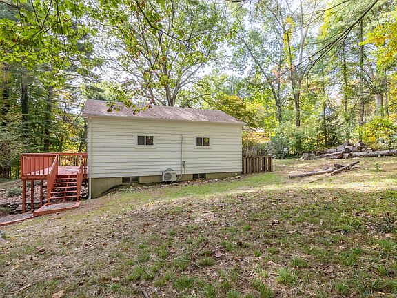 This inviting 2 bedroom, 2 bath ranch is nestled in a private wooded setting offers 962 sq. ft. of comfortable living space. Step inside to find hardwood floors throughout, renovated kitchen and bathrooms, fresh paint, and new flooring in the living and kitchen areas. The large windows fill the home with natural light. Enjoy the peaceful surroundings from the spacious deck, perfect for relaxing or entertaining guests. The home features one standard sized bedroom and one smaller room ideal for a home office or guest space but can certainly be used as a smaller bedroom. The unfinished basement provides ample storage and laundry area. Experience comfort and tranquility in this lovely home just minutes from the heart of Mansfield Center and easy commute to ECSU, UCONN and area amenities.