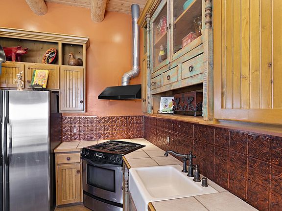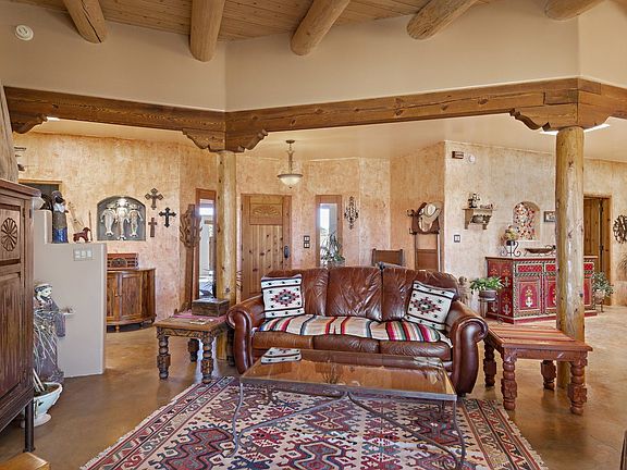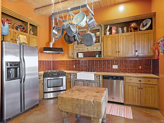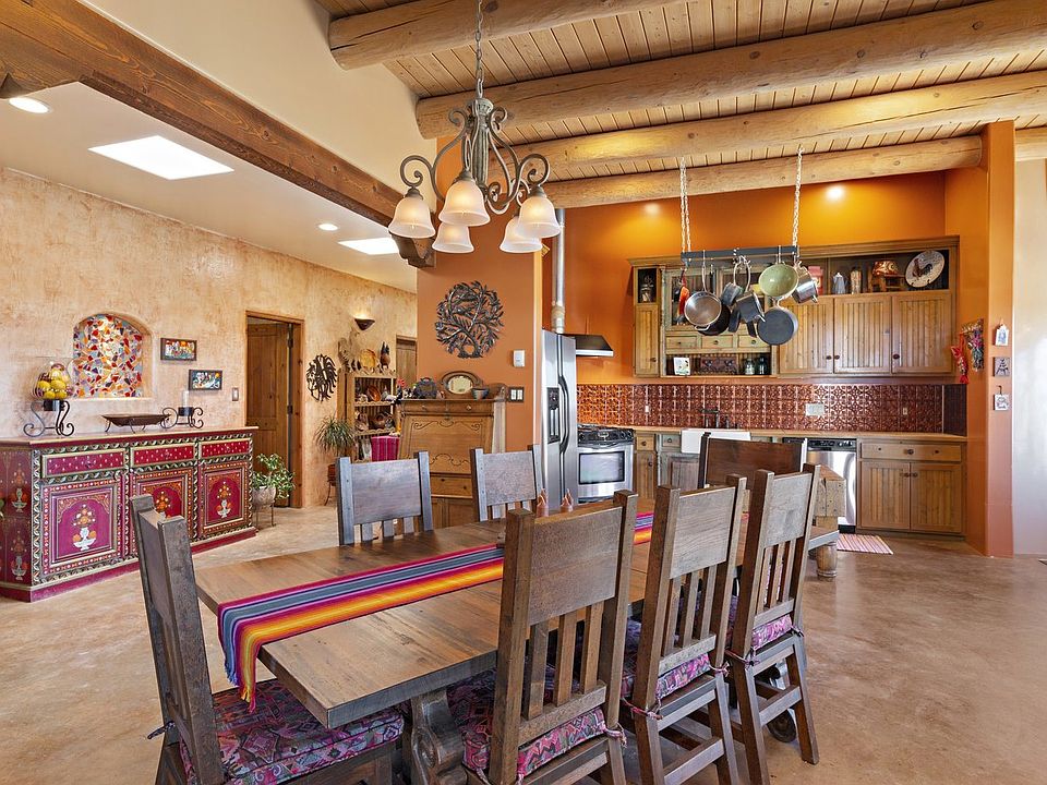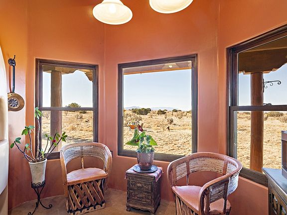 This Eldorado location rarely comes on the market. AMAZING FOREVER VIEWS. On the ranchland side of Quedo Rd., this one-owner all-custom home features a truly open kitchen, living room and dining room. Pretty kitchen has stainless appliances, farm sink and a beautiful copper backsplash. The darling breakfast area has a raised wood-burning kiva fireplace. Colored concrete floors throughout and in-floor, natural gas radiant heat. Long and deep rear portal and one of the largest covered front portals in Eldorado offer a variety of outdoor options. Three bedrooms plus a dedicated office space. The separate happy and sunny studio space is just steps from the main house and has plenty of work area, tile floor and a sink. Two-car oversized garage is 576 square feet. NO CARPET. NO STEPS. PLUMBING AND RADIANT HEAT IS WIRSBO.