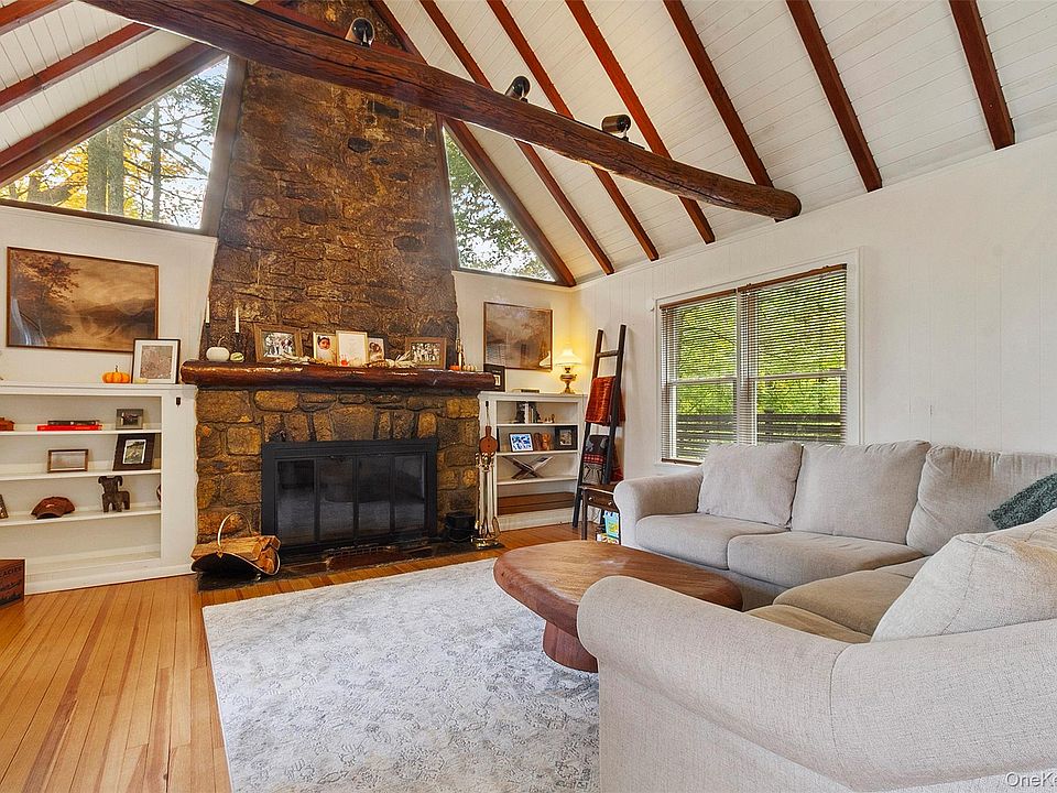 Inside, the home’s thoughtful layout is designed for both comfort and flow. The spacious living room features a vaulted ceiling with rustic beams and a striking stone fireplace, seamlessly connecting to the custom designed dining room with built-ins and large windows that frame the natural landscape. French doors open to a lovely deck perfect for entertaining with views of the lake. An additional cozy patio—ideal for gardening, or simply unwinding with a good book. Whether you’re hosting a summer gathering or relaxing fireside in winter, every space in this home invites connection and calm.