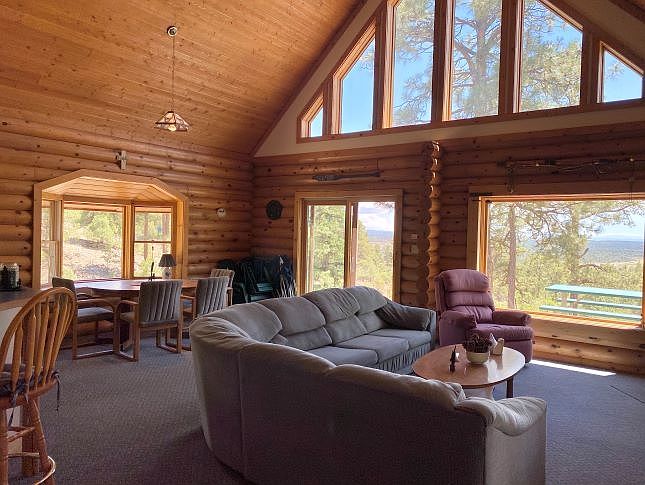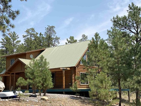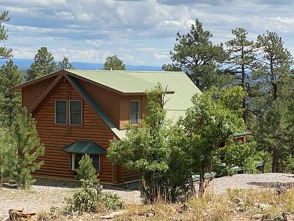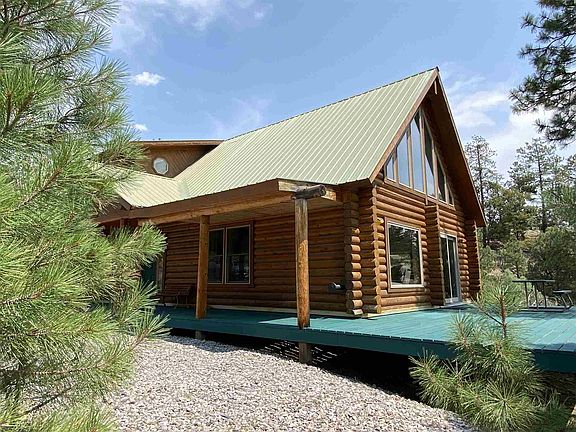 Beautiful log cabin with open concept living and kitchen area and sits on approximately five acres. This two-story three bedroom two bath home is situated in the peaceful Laguna Vista Subdivision, a gated community and close to two lakes. Lots of trees! There is a rock canyon ridge on the SE corner of the property that provides plenty of seclusion. Gorgeous views off the deck and plenty of wildlife meander thru this mountain property, including dear, elk and wild turkey.