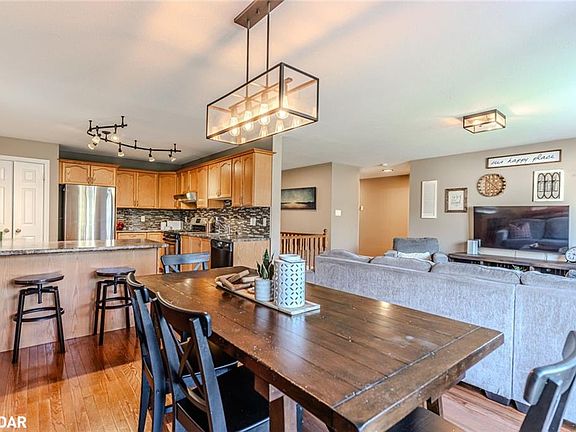 RAISED BUNGALOW WITH IN-LAW POTENTIAL ON NEARLY HALF AN ACRE WITH ATTACHED GARAGE & A LOFT! Nestled in a peaceful Hawkestone setting near Lake Simcoe, this charming raised bungalow captures the best of small-town living with quick access to Highway 11 and is approximately 15 minutes to both Barrie and Orillia. Spend your days by the water at the nearby Hawkestone dock, pavilion, boat launch, and Oro Beach, or explore scenic trails only a short walk away. The nearly half-acre lot offers ample outdoor enjoyment with a large deck, two sheds, a fire pit, a chicken coop, and a kids' playset. The front of the home showcases great curb appeal, featuring an interlock walkway and a welcoming covered porch. The open-concept main level features hardwood and tile flooring, timeless finishes, and a bright kitchen with wood cabinetry, a breakfast bar, pantry, and some stainless steel appliances, including a gas stove, with clear sightlines into the living and dining areas. A walkout from the dining room opens to the back deck, where mornings start with coffee in the fresh air and evenings end surrounded by the sounds of nature. The primary bedroom includes a 3-piece ensuite and two double closets, while the main floor laundry with a sink adds everyday practicality. The fully finished basement, featuring a separate entrance, offers in-law potential and includes a cozy rec room with a gas fireplace, built-in bookshelves, a fourth bedroom, and a full bathroom. The attached two-car garage includes a loft area that provides additional storage, and the home is equipped with an 11 kW Generac generator. A truly inviting #HomeToStay in a setting that's easy to fall in love with.
