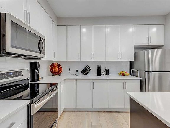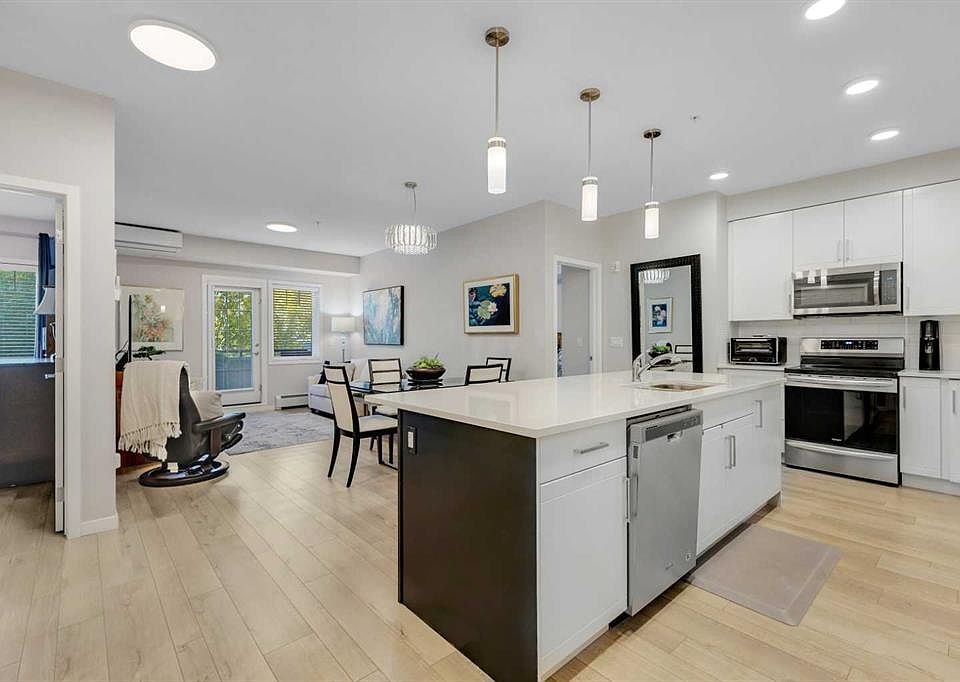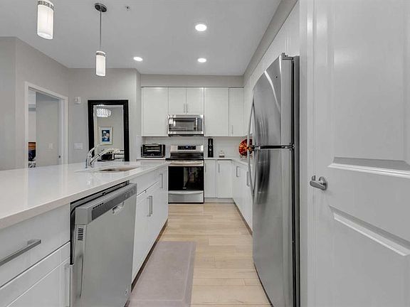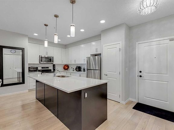 Welcome to your new home in Sandgate at Mahogany, located in one of Calgary’s most vibrant and amenity-rich lake communities. This beautifully designed two-bedroom, two-bathroom condo offers a perfect blend of comfort, style, and functionality—ideal for homeowners and investors alike. Inside, you'll find a spacious kitchen outfitted with sleek white 42" raised cabinets, elegant 1.25" quartz countertops, an oversized island with ample seating opportunities, stainless steel appliances including induction stove, and a garburator for added convenience. The kitchen opens into a thoughtfully laid-out living area that separates the two bedrooms—offering privacy and flexibility whether you're hosting guests, working from home, or sharing the space. The primary bedroom features a walk-through closet that leads into a private three-piece ensuite complete with a glass shower. The second bedroom is located adjacent to a full four-piece bathroom, perfect for guests or family. Luxury vinyl plank flooring runs throughout the main living spaces, and a dedicated laundry room with built-in pantry-style storage adds to the overall functionality. For year-round comfort, the unit includes air conditioning. Step outside to a large, north-facing covered balcony surrounded by mature trees, providing natural privacy and a peaceful place to relax. The balcony is equipped with a gas line for your BBQ, and the patio door features blinds encased in glass as well as a retractable screen—combining practicality with comfort. A titled underground parking stall is also included for added convenience. Located just a short walk from grocery stores, shops, cafes, and restaurants, this home offers unbeatable access to everyday essentials. And beyond your front door, Mahogany’s incredible amenities await—including 22 kilometers of scenic pathways, two private beaches, expansive parks, playgrounds, off-leash areas, and beautifully maintained green spaces. As a resident of Sandgate, you'll also enjoy access to a fitness studio, a lending library, guest suite, and pet-friendly policies—all in a building designed with character, quality, and livability in mind. This isn’t just a home—it’s a lifestyle. Don’t miss your opportunity to own in one of Calgary’s most desirable lake communities.