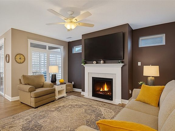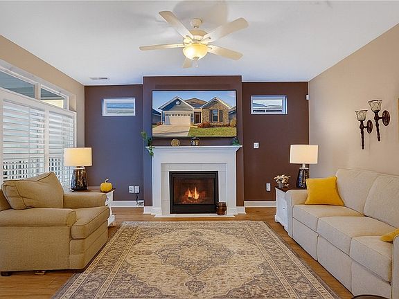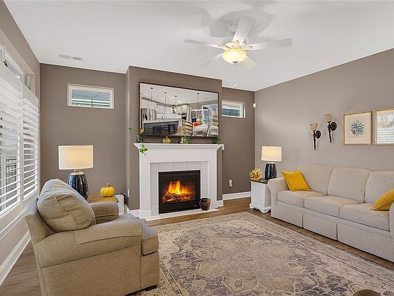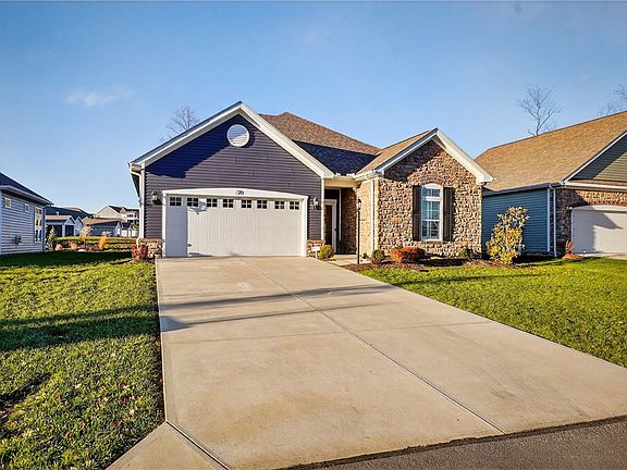 This newer home, built in 2022 is MOVE IN READY in 55 and up community! You can just bring your clothes and toothbrush because everything is done for you! This open floorplan has a large kitchen with gorgeous granite counters, island seating, lazy Susan, wall oven and microwave combo, and crown molding. Dining area has sliders that open to covered rear patio and additional area with retractable awning, and level fenced yard. 1st Floor laundry and storage area. Living room has pretty gas fireplace with mantle. Primary bedroom has plantation shutters, 9 ft ceilings, and ensuite with walk-in closet and walk-in shower & double bowl sinks. The second bedroom is split from the master for maximum privacy. 2 Car garage with plenty of storage. Close to outlets, restaurants, casino and Pittsburgh! Pool, clubhouse, gym, snow removal, lawn care are all included