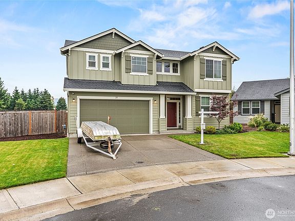 Here is your chance to own this original owner two-story home built in 2023. This open floor footprint is ideal for everyday living and entertaining. The home features a living room with a charming fireplace, modern quartz kitchen and dining area with patio access. Versatile main floor bedroom/den. The second floor hosts four additional bedrooms and 2 full baths of which the primary bedroom has double doors that open to an en-suite bathroom with spa tub, double sinks and walk in closet. The spacious lot has a covered patio and backs to a greenspace with trails and waterway. Two car garage complex this perfect 10 out of 10 home.