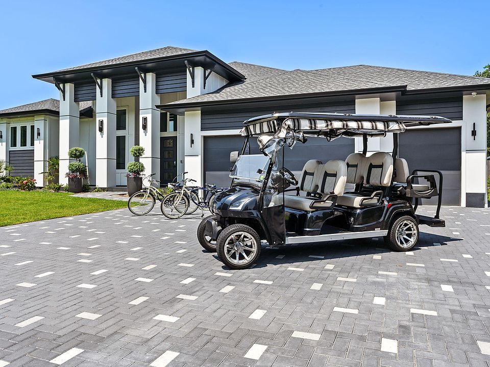 A climate-controlled garage (814 SF) accommodates two vehicles, and a golf cart parking space includes two EV charging stations. The interior living space features a sleek electric fireplace, while the lanai includes a gas fireplace, creating atmosphere and warmth in any season.