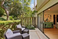 Gas fireplacePrivate balconiesReimagined kitchen layoutRe-landscaped stone patioWhite oak wood floorsBlue cabinetryQuartz counters