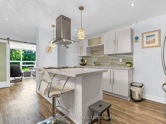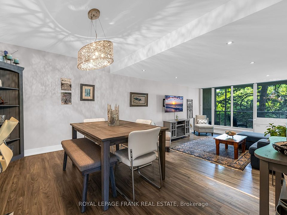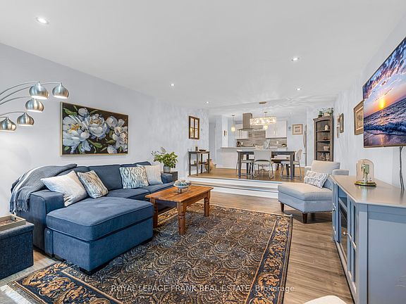 Elegant Oakville Condo 1243 sq.ft, 3 bedroom, 2 bath, corner suite at the very end of the main floor very quiet, yet 5 steps to to the buildings back entrance accessing lush greenery, trees and benches!! Open concept, professionally renovated top to bottom. Mega-master bedroom easily accommodates a king size bed & boasting one full wall of closet space. The open concept great room is impeccable, combining kitchen, dining rm, sunken living rm and spacious private balcony and outstanding entertainment space dining room can accommodate 10-12 guests! Loads of above ground guest parking! The condo is nestled between the banks of Sixteen Mile Creek and Kerr St. An easy 10 minute stroll to Oakville Go Train! 5 minute drive to QEW! Kerr Street with dozens of stores, restaurants, specialty shops. Less than one km to downtown Oakville which offers another dimension of high end coffee shops & fine dining.