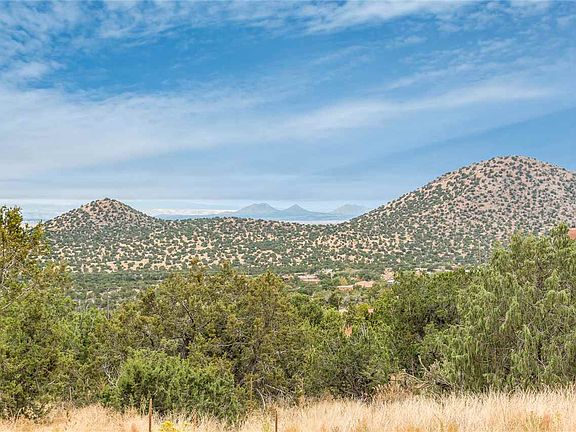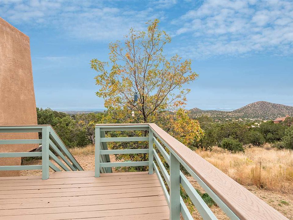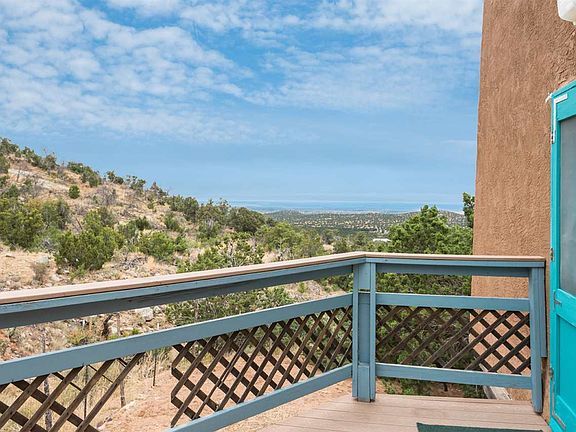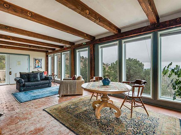 Shabby Chic and World Class Views. This rustic, single level cabin is just 10 minutes outside of the New Mexico State Capitol of Santa Fe. As a primary residence or home away from home this private high desert setting offers serene and quiet enjoyment of your own six acres. There are 4 view platforms to relax, entertain, or even create plain-air works of art. The pueblo style home of sturdy construction provides passive solar warmth, and wood stove heat. Gas hook ups are already in place in the basement for anyone preferring a more conventional system. Old world rustic accents add to the unique ambiance. These include old beams, farm sink, naturally stressed brick floors, and a blending of indoor and outdoor space through a wall of windows. Many mechanical upgrades have been taken care of. This rare find will go fast. Make your appointment today.