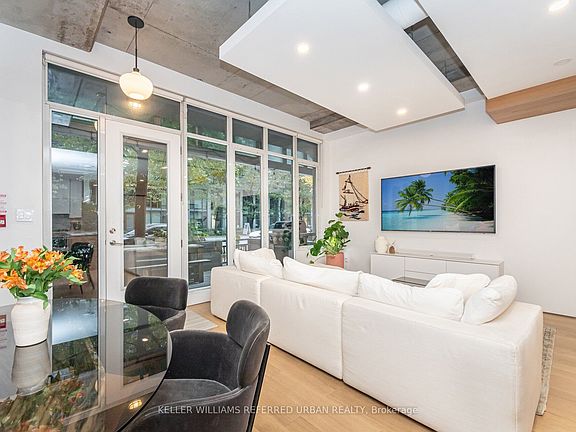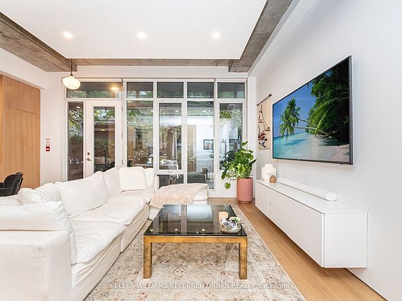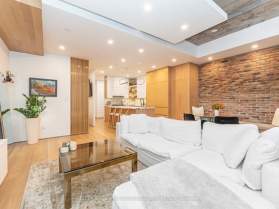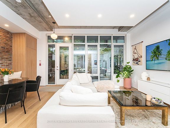 Step into this rare live-work opportunity in the heart of King West at Twenty Stewart Lofts, which offers the flexibility to operate your business or enjoy boutique loft living - all with private front-door access directly from Stewart Street.Beautifully renovated in warm white oak, this modern suite features solid wood oak flooring, soaring 11-foot exposed concrete ceilings, 9-foot finished ceilings with potlights throughout, and full-height windows that flood the unit with natural light. Thoughtfully designed custom millwork throughout provides exceptional style and abundant built-in storage.With just under 800 sq', the layout includes 1 bedroom + a separate den, a sleek 3-piece bath, a built-in bench for a separate dining area, and ensuite laundry with a full-size stacked washer + dryer. The kitchen is equipped with high-end European built-in and panelled appliances, a large island with a separate drink fridge, and book-matched marble throughout with exposed shelving and LED lighting. The hotel-inspired bathroom screams luxury with heated flooring, black large-format tiles, a curbless shower with custom black privacy glass and a floating vanity with huge LED light mirror. Enjoy seamless indoor-outdoor flow with a spacious private terrace, perfect for work breaks, entertaining, or quiet relaxation.Whether you're an entrepreneur seeking a polished storefront-style presence or someone wanting a sophisticated home in King West, this unit delivers unmatched versatility and style.Situated in the bustling King West area, this neighbourhood is a hotspot for culture, dining, nightlife, and downtown living. Once a warehouse and industrial zone, the area has been transformed into one of Toronto's trendiest corridors, lined with upscale restaurants, sleek condos, and designer retail. Parking at 550 Wellington St, Underground $260/month including taxes.