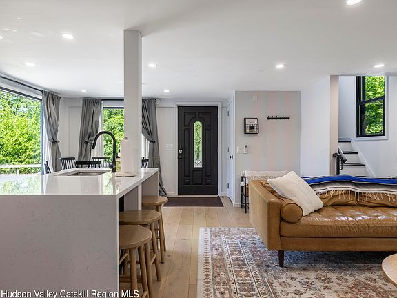This turn-key, completely renovated modern farmhouse is ready to welcome you! Just 12 minutes from the Windham Mountain Club and only a short drive to Hunter and Belleayre, this stylish 3-bedroom plus open sleeping loft retreat delivers four-season Catskill charm with designer finishes and a prime location for both lifestyle seekers and short-term rental investors. Step inside and be captivated by the open-concept great room—anchored by gleaming wood floors, crisp white walls, and striking modern accents throughout. The kitchen is a showpiece, boasting stainless steel appliances, granite countertops with a dramatic waterfall-edge breakfast bar, and sleek lighting, all flowing seamlessly into the living and dining areas—perfect for cozy gatherings after mountain adventures. Upstairs, the open loft—currently used as a sleeping space—features French doors that lead to a large balcony with sleek cable railings, offering tranquil views of the rushing stream below. Sleep with the doors open and fall asleep to the gentle sound of water meandering just steps from your door. Bathrooms are spa-like, featuring oversized walk-in subway tile showers, a soaking tub, and contemporary vanities that add a luxurious touch to this cozy mountain home. The home is equipped with new ductless air conditioning units in every room to ensure year-round comfort. A privacy fence along the property line ensures seclusion while enhancing the outdoor living experience. Enjoy cool evenings around the fire pit, warm coffee mornings on the covered front porch, and sunny days on your private balcony. Recent improvements include fresh landscaping, a newly poured concrete basement floor, and a brand-new stone walkway. With municipal water and sewer already connected, ownership is simple and stress-free. This charming property is being offered fully furnished, making it truly move-in or rent-ready. Whether you're a first-time buyer, looking to downsize, or hoping to secure a well-priced second home in the Catskills, this home checks every box. Enjoy year-round activities like hiking or hunting in nearby state land, fishing the Batavia Kill, or skiing Windham, Hunter, and Belleayre Mountains—all easily accessible from your new home base.