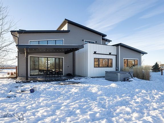 Welcome to this absolutely stunning home in the peaceful Coolwater Landing subdivision, located in the Monforton School District. This magnificent layout features five bedrooms, spanning 4,308 s.f. of living space on a spacious, nearly three-acre fenced lot. An ADU can be added to the property if so desired. Ground level and second level outdoor patio spaces make the place feel even larger and provide stunning views in every direction. Throughout the home you will find elegant tile and beautiful engineered hardwood flooring, quartz countertops in the kitchen and bathrooms, a walk-in pantry and a large island perfect for entertaining, huge walk-in closet and walk-through shower in the master bedroom, upstairs bonus room with large sliding door leading to a walkout balcony. Every bedroom has its own bathroom. The extra bedroom on main level can also function as a great office space. Interior also includes two large full bathrooms, two large 3/4 bathroom, and a half bathroom for guests. Sit outside in your hot tub while looking at the Bridger Mountains. So many elegant and thoughtful touches in every corner of this house.