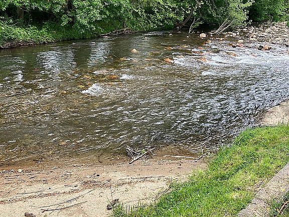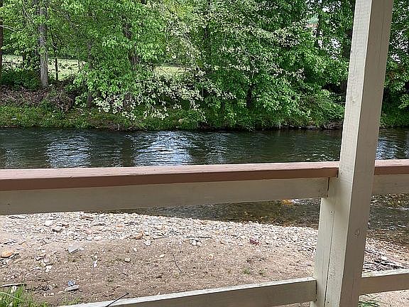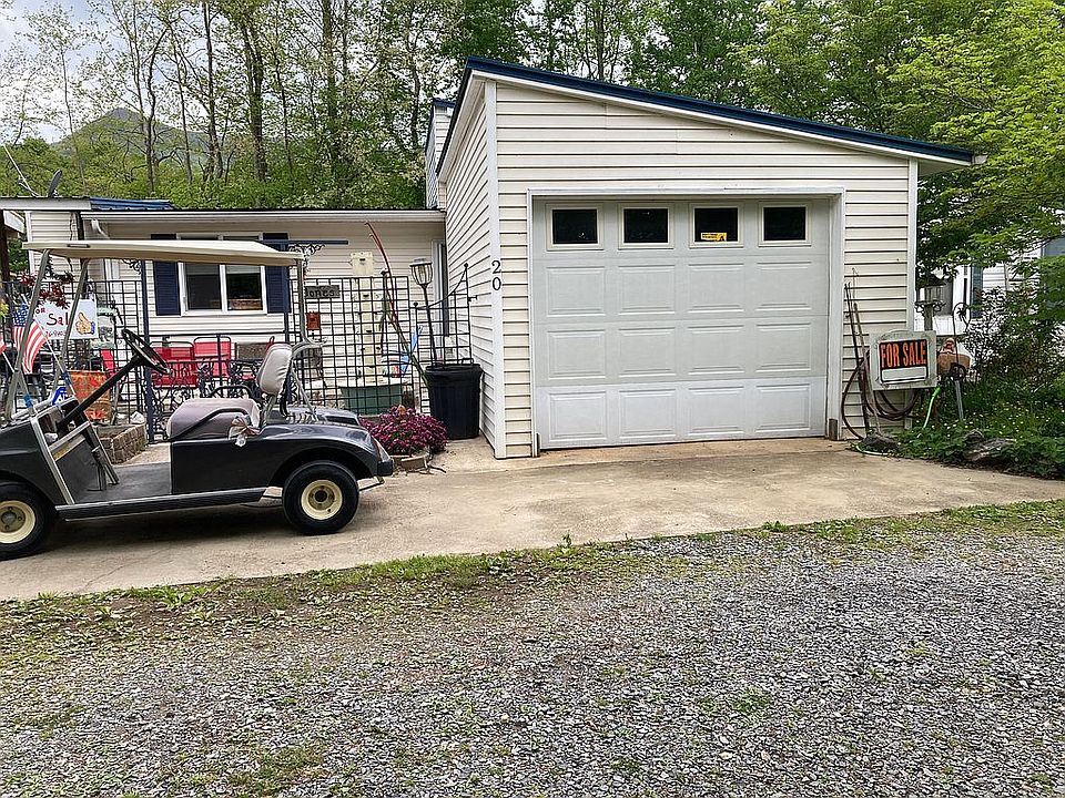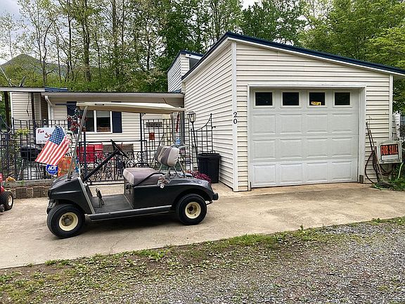 900 sq feet (30X30) plus deck, attached shed, detached garage, decorative iron patio fencing with decorative sliding front gate, and side gate. Mountain home on lovely scenic trout stream, view from deck or great room. Recent renovation for laminate wood look flooring in kitchen, new long kitchen counter that can be used to serve meals and large work area, hallway and bathroom, new bathroom vanity, large bedroom,10 Anderson double pane windows in great room that drop open to clean exterior. Connections for laundry facility. Covered roof between house and garage. Large closet in garage, used for seasonal clothing. Concrete area in front of one car garage for parking second vehicle. Small garden areas for vegetables and flowers.