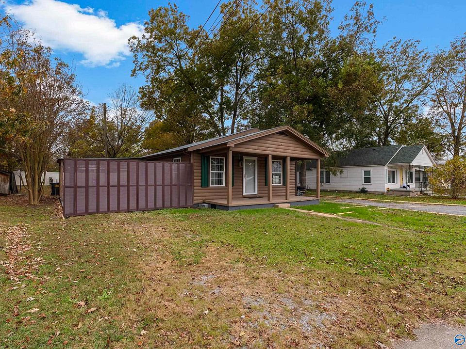 Beautifully remodeled and move-in ready! This cozy 1BR/1BA Falkville home offers modern updates and timeless charm. Features include freshly stained log siding, painted metal roof, new insulated windows, gutters, shutters, and lighting. Inside you'll find walnut-stained hardwoods, an updated kitchen with butcher-block counters and new appliances, and a fully renovated tile bath with glass doors. New mini-splits, gas heaters, electrical, and PEX plumbing—and so much more! Don’t miss out on this wonderful opportunity!