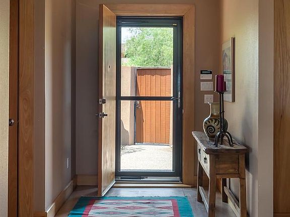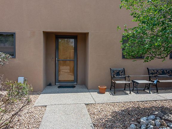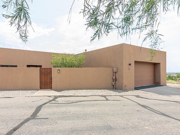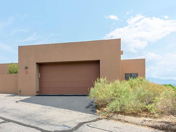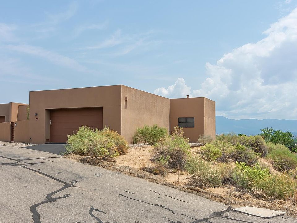 Spectacular sweeping VIEWS of the Sandia Mountains, Bosque, city & downtown! Stunning single level home (previous model) loaded with upgrades! Private courtyard entry! Step inside & experience open floor plan with custom features: Pella wood windows & doors, concrete & wood floors. Deluxe kitchen equipped w/Wolfe appliances, Subzero & wine refrigerator, custom cabinets, granite counter tops & breakfast bar. Formal dining room opens to the beautiful great room with gas log fireplace raised ceiling & wall of window with expansive VIEWS! Generous master suite offers gas log fireplace, walk-in closet w/built-ins & luxury bathroom with granite, large shower. Off the master is an office/exercise room w/views! Double glass doors open to the 3rd bedroom. Amazing open patio to enjoy the VIEWS!