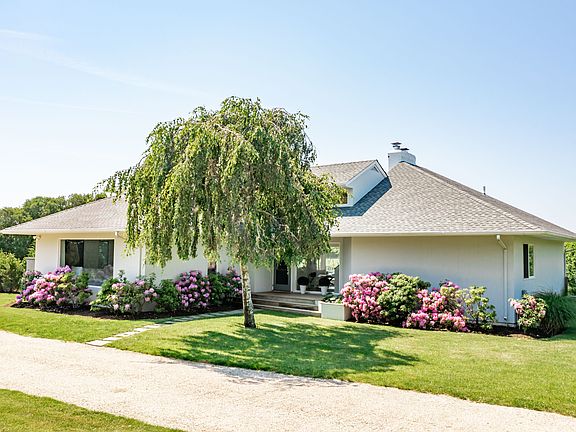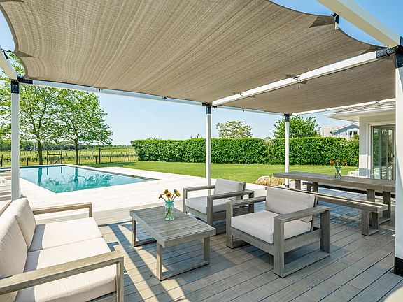 Overlooking a picturesque vineyard, this contemporary home offers a seamless blend of style, comfort, and outdoor living. A recently added 50-foot heated gunite pool, hot tub, and trellised dining area create an inviting space for relaxation and entertaining. Set back from the road on a beautifully expansive lawn, this four-bedroom home is designed for both openness and privacy. Natural light fills the open living and dining areas, with a vaulted ceiling and fireplace adding warmth to the living room. A separate media lounge at the front of the house provides a cozy retreat for movie nights or quiet moments. The second-floor primary suite is generous in size, offering a private escape, while two first-floor bedrooms share a bath. A fourth bedroom adds extra flexibility for guests or work-from-home needs. A powder room is conveniently located off the dining area, and a dedicated laundry room adds to the home's functionality. With neighborhood home values supporting expansion, there is an excellent opportunity to increase the above-grade square footage. Located on Winding Way, this home enjoys a peaceful setting with no through traffic while being just 3 miles from Flying Point Beach and close to Southampton and Bridgehampton. A rare opportunity to own a modern retreat with breathtaking vineyard views.