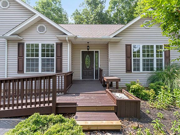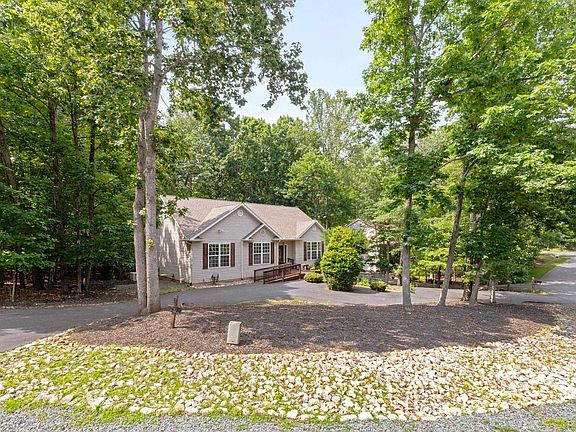 Custom ranch in Lake Monticello featuring vaulted ceilings, hardwood floors, and a floor-to-ceiling stone fireplace. The kitchen offers maple cabinetry, stainless appliances, and ample counter space. Includes a bright sunroom and a half-finished basement with plenty of storage. Located just two blocks from Beach 4 in a gated community with lake access, golf, and more.