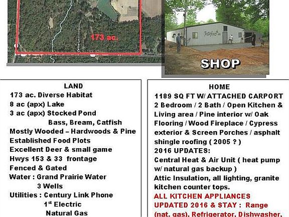 Nestled on 173.6 acres this custom cypress home would be a wonderful home place, rural retreat or hunting club. The owners paid special attention to details in the construction of this home to provide for easy care and maintenance. The living area has a wood burning stove that can provide heat for the entire home. The kitchen opens to the living area and has new granite counters and all new stainless steel appliances. The laundry room is conveniently located and the new washer & dryer convey. Each bedroom has sliding glass doors that open to the screened wrap around porch. Outside find 40' X 80' heated and cooled shop with full bathroom. Near the home is a 3 acre stocked pond with deck. The wooded acreage provides a diverse habitat for the sportsman and an 8 acre stocked lake offers fishing and duck hunting and has 700 gallon minimum electric well, established food plots, mixed timber, native grasses, 6 deer stands, duck blind and Wild Cat Creek that runs seasonally. Trophy bucks have been harvested from this property. A recent survey has been completed and the boundaries have been marked or fenced. Lot size taken from recent survey and square footage taken from tax card. Call Sand