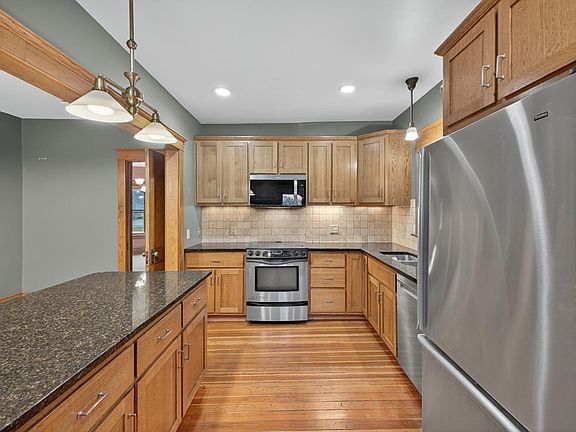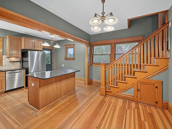This is a charming 1919 home with original character and modern updates! Step into timeless elegance with this beautifully maintained home that blends historic charm with thoughtful updates. Original woodwork, stunning pocket doors and a beautiful built-in oak buffet showcase the craftmanship of a bygone era, while modern conveniences make it perfect for today's living. The main floor features a welcoming foyer, spacious living room with built-in bookcases, formal dining with buffet and remodeled eat-in kitchen with custom cabinets, hard surface counters, new appliances (stove, microwave and dishwasher). A unique double staircase adds architectural interest and easy flow throughout the home. Upstairs there's four spacious bedrooms and a remodeled sleeping porch porch converted into a primary bedroom retreat featuring a clawfoot tub, shower and walk-in closet. There's also a full walk-up attic, ideal for storage or future expansion. Enjoy peaceful mornings or evening relaxation on the inviting front and back porches. Don't miss the original 2-story barn with large loft and parking and storage for 2 cars plus lawn mowers, snow blowers and lawn tools. The home is located on a private (corner) double lot (141x121).The home is a rare find for anyone who appreciates the character of early 20th century craftsmanship paired with all the modern conveniences.
