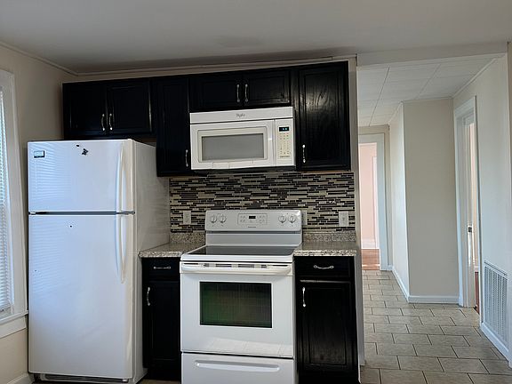 Updated kitchen with modern backsplash, energy efficient appliances including electric range, over the range microwave and full size refrigerator.