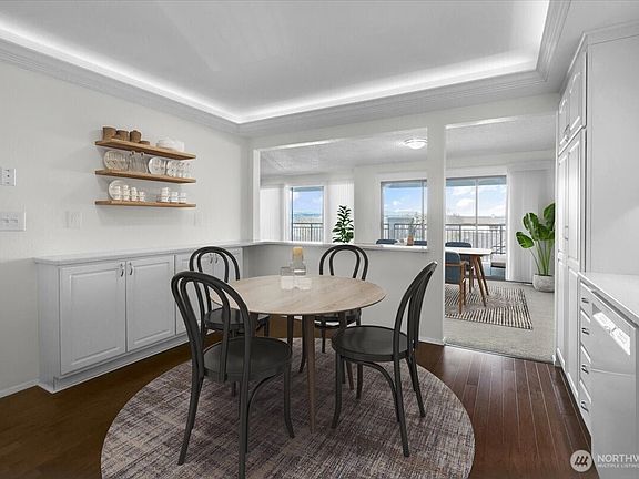 Panoramic Sound & Olympic Mountain Views highlight this ideally located Condominium just a short walk to Ferry Dock, Waterfront and all that Downtown Edmonds has to offer. Width of unit Deck is the perfect spot to relax and enjoy the beautiful Sunsets. Unit features Large Living and Dining Rooms next to the West Facing Wall of Windows. Remodeled Kitchen with abundant cabinet space and area for table & chairs. Primary Bedroom has walk-in Closet and double sink vanity as part of 3/4 Bath. Laundry Room with Cabinets/Storage and Utility Sink. 2 parking spaces included: 1 in the Gated Garage & one space in the Alley. 2 Storage spaces-1 on Deck, 2nd located on Ground Floor on back wall of Northwest parking area. Very well maintained 55+ Community