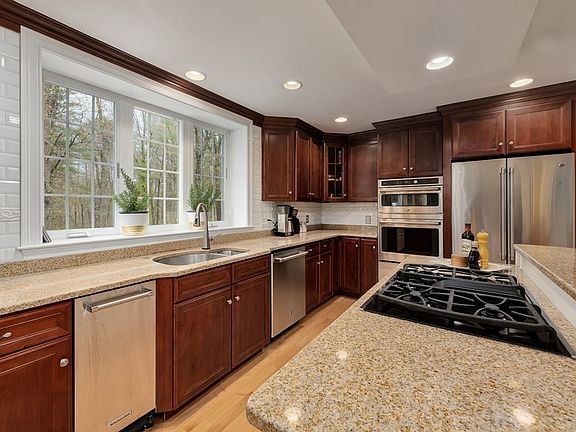 Stunning colonial on over an acre with elegant finishing touches in every room! The large kitchen has a center island with gas cooktop and seating, and a casual dining area with sliders to the deck. French doors lead to a formal dining room, with lovely tray ceiling and built-in cabinetry. The spacious family room has a striking fireplace, and adjoins the kitchen for easy entertaining. Upstairs, the master suite has a walk-in closet and sunny master bath with soaking tub, tiled shower, water closet, dual vanity and radiant heat. Three additional bedrooms and another full bath w/laundry complete this level. The generous office walks out to the patio and connects to a bonus room. Plenty of storage in the full walk-up attic. The private backyard backs on open land and has a generous patio with a firepit and labyrinth garden. Brazilian cherry floors, crown molding, wainscoting, pilasters and ceiling medallions add to the sophistication of this home!
