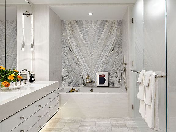 This 1,815 square foot two bedroom, two and half bath condominium offers ample living space and a gracious layout typically found in a much larger apartment. The Foyer, with a White Ice marble floor, leads to an impressive 15’3 x 28’10 Living and Dining area with 10’ ceilings, custom French White Oak floors in a chevron pattern and soaring, floor to ceiling windows facing east. The large open kitchen offers abundant storage and work space and is a striking showpiece blending slabs of honed Calacatta marble with custom Italian made oak cabinetry and brushed nickel accents. State of the art appliances include a Sub-Zero refrigerator, freezer and wine chiller, a 36 in. Wolf Dual Fuel Range and a Miele speed oven, warming drawer, and dishwasher. Above the range, a sleek slab of marble ingeniously conceals an externally vented hood creating an ideal balance of beauty and function. The Primary Bedroom Suite is a spacious retreat. The Primary Bath’s cool palette epitomizes serenity and features a Calacatta Cielo feature wall, white marble and lacquer vanity with double sinks, Iceberg marble floor with radiant heating, a walk-in shower with marble bench and a deep soaking tub. Polished nickel sink and bath fittings by Fantini, Jonathan Browning wall sconces and recessed niches add elegant, well-considered touches. The second bedroom also has a private en-suite bathroom. The Powder Room is a glamorous tribute to old New York with a custom mosaic floor in Vanilla Pearl and Saint Laurent marble. Together with a hammered-metal sink, Murano glass handles and custom glass pendant light, this room leaves a lasting impression and expresses an eye for detail, function and quality. In addition to six closets, this apartment also has a large Laundry Room. With floorplans inspired by the gracious layouts of pre-war apartment buildings, each residence at 200 Amsterdam has been reimagined for contemporary living and offers ceiling heights of up to 10 feet, high performance, year-round zoned central heating and cooling systems for individual climate control, air filtration, sound attenuation technology, dedicated laundry areas with washing machines and fully vented dryers, pre-wiring for cable, telephone, Internet and motorized shades, and high performance windows with Low-E coating and UV protection.