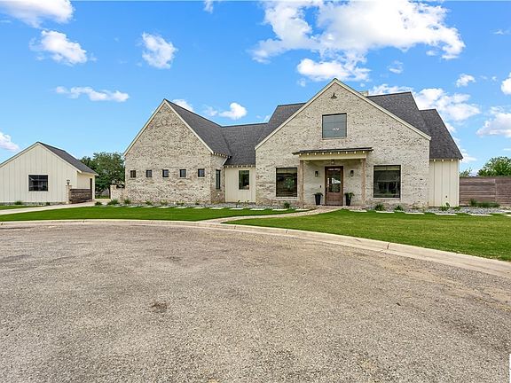 Luxury living & small town charm, this custom home on a sprawling 2+ acre manicured lot is truly turn key. The interior is adorned w white oak wood floors, quartz countertops, smeared brick, ship lap accents, & is centered around the hearth. Gourmet kitchen equipped w Frigidaire fridge, double ovens, center island, Thermador gas range, griddle & butler pantry. Master en-suite w his/hers vanities, soaking tub, spa like retreat & spacious walk-in closet. Laundry room w drying racks, sink, folding counters & spare fridge. All bedrooms on main level w office, gym, media room & music nook upstairs. Outdoor covered porch w grilling station, leathered granite island, & fridge. Upgraded with an in ground pool, jacuzzi, sand volleyball court, horizontal cedar privacy fencing, stained concrete pavers, xeriscape river rock & music surround. Attached carport w sports lockers lead to the mudroom. Bonus workshop & space to build a pool casita. Quick bike ride to Green Dickson Park & Shiner Brewery.