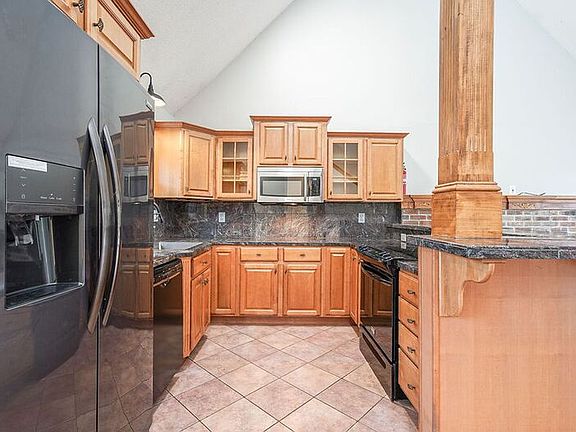 Brick hearthStone wallsOpen-concept layoutHardwood floorsDual slidersVaulted ceilingsGranite counters