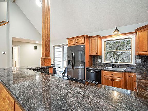 Set on 1.9 acres with stone walls and perennials, this home features an open-concept layout with vaulted ceilings, brick hearth, and hardwood floors. A maple kitchen with granite counters and pantry flows to the dining area. Dual sliders lead to a deck. Conveniently close to highways. Furnishings not included.