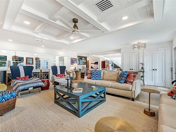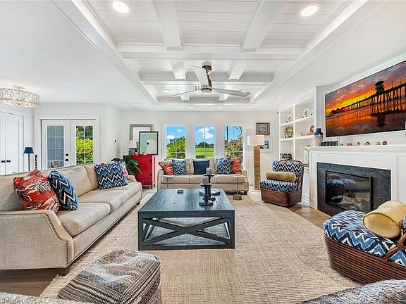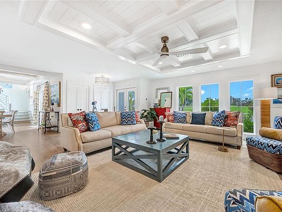 Gorgeous completely renovated home including a new roof and hurricane windows with sweeping east and west golf course views located in the heart of Naples. This coastal theme home exudes effortless style with all of the fine details; the living room displays a beautiful, coffered ceiling and fireplace, a formal dining room with a nearby wine room, and a chef's kitchen with a large island for the family to gather. The home boasts 5 bedrooms and 3 full bathrooms; a spacious layout with an abundance of natural light. The first-floor master bedroom has 2 large closets; hers opens up to the lanai. The second guest bedroom is ensuite on the first floor with a nearby office convertible to a bedroom. Upstairs, there is a cozy loft sitting area, accompanied by two bedrooms and a shared Jack/Jill bathroom. Outdoor living is elevated with a screened lanai showcasing a pool with a swim-up table, fenced yard and a separate patio area with a raised hot tub and grill. Just minutes to the beach, fine dining, and shopping. This neighborhood is a true hidden gem of Naples.