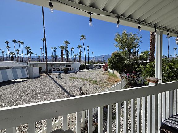 Located in the Royal Palms 55+ community, 200 Butterfield is a 2020 Cavco 904 sq. ft. two bedroom / 1 3/4 bath manufactured home affording the ultimate in contemporary desert living. A large southwest-facing deck affords sweeping mountain views and provides visitors the front entry into the home's bright and spacious living room. The well-designed, fully-equipped eat-in kitchen offers smart dark cabinetry with a bright dining area. Down a short hallway, to the left, is the guest bedroom, currently out-fitted as an office, next to which is the full guest bathroom. Opposite is the laundry area with side-by-side W / D and overhead cabinetry for storage. At the north end of the home is the large primary bedroom featuring a large window that provides more inspiring mountain views and the capacious primary ensuite 3/4 bathroom with dual vanities. The east-facing leisure door to the right of the hallway opens to the covered parking area, at the back of which is a single large storage shed. The home has an extensive stone-covered yard that leads back around to the comfortable and extensive deck. All windows in the dwelling are double-pane, and the home has central heating and A / C as well as two ceiling fans. 200 Butterfield is sold unfurnished. Approval by park management at the Royal Palms is required for purchase; monthly space rent for this home will be $892.00 per month for the new owner, a figure to be verified by buyer.
