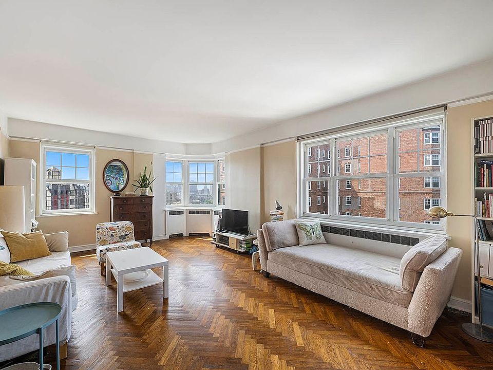 The oversized primary bedroom boasts three exposures—east, north, and south—allowing for stunning natural light and a striking view of the Empire State Building. Beautifully maintained herringbone parquet floors and well-kept walls provide a solid foundation ready for your personal design touch.