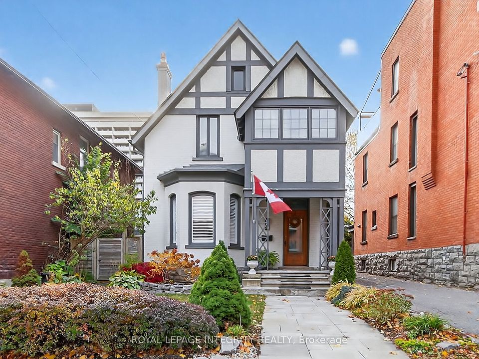Step into history with this beautiful Tudor-style home built in 1872. Originally a farmhouse, it later became part of Ottawa's early city growth-serving as the Bank of Ottawa in 1908 and the Bank of Nova Scotia from 1919 to 1922. Fully gutted and rebuilt in 2016, including a new foundation, this property offers the perfect blend of historic charm and modern living. The main floor -showcasing impressive 10-ft ceilings- features a spacious living room with views of the Canal, a large dining area, a two-piece bath, a versatile den ideal for an office or reading nook, and a gourmet custom kitchen that opens to a cozy family room. A stunning curved staircase leads to the upper level, where you'll find two bedrooms and a luxurious four-piece bath, followed by the elegant primary suite complete with a Juliet balcony and a spa-inspired ensuite. The lower level is fully finished, offering nine-foot ceilings, ample storage with built-ins, a bathroom, laundry room, and a generous family room with direct access to the rear yard-perfect for a home-based business. With the 2016 transformation came new foundation, plumbing, electrical, heating, and more. Beautifully landscaped front yard, private back patio, and detached single-car garage complete this rare gem in the heart of Ottawa-where history meets modern lifestyle.