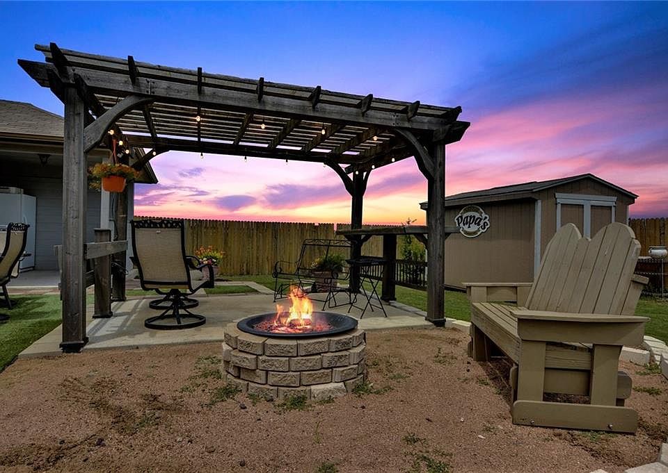 Located on a corner lot in the Hutto Highlands neighborhood! This unique floor plan is over 2,200 sqft with 4 bedrooms all a great size. The dining room has a buffet & built-in cabinets. Living is open to the dining and kitchen area. Spacious master bedroom with huge walk-in closet. Master bath has Garden tub, separate walk-in shower, & double vanity. Garage has epoxy floors and is great for someone looking for workshop space. The back yard is gorgeous. your covered back patio looks out at a pergola & fire pit perfect for entertaining.