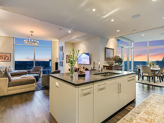 The residence at 35AC, masterfully designed by Lindsay Maki of McWalters Collaborative Architecture + Design, is truly one-of-a-kind in the building. Clearly planned with luxury and functionality at the forefront, featuring custom elements throughout, including Rift Sawn Oak cabinetry & paneling, complemented by Scavolini millwork. Premium finishes such as Ann Sacks and Artistic Tile, along with pecan flooring, add elements of warmth & sophistication. The kitchen is a chef’s dream, equipped with a built-in SubZero refrigerator, a high-end Italian Bertazzoni cooktop and double ovens, & a Miele dishwasher, all enhanced by Waterworks & Dornbracht plumbing fixtures. For convenience, there is a butler's pantry for daily appliances and a walk-in pantry that includes two full-sized wine refrigerators. The separate built-in bar, featuring a bar sink, beverage refrigerator, and floating glass shelves, makes entertaining effortless, as it is separate from the main kitchen area. This unit offers floor-to-ceiling windows and balconies with sweeping panoramic views of Lady Bird Lake, the city skyline, and the Texas Hill Country. The tranquil primary suite is a true retreat, featuring a private office and two custom-designed walk-in California Closets. A private guest suite with an en-suite bathroom boasts the same breathtaking views as the primary suite. Designed for flexibility, the den is perfect for day-to-day use, equipped with a drop-down theater screen and surround sound. However, when guests are visiting, this room transforms into a 3rd bedroom with a Murphy bed and direct access to a full bathroom. Well-thought-out storage throughout, including extra-deep closets and cabinets, drawers throughout the kitchen, and two storage units totaling over 107 SF. An integrated Savant whole-home AV system ensures seamless entertainment, enhancing the home’s state-of-the-art appeal, and incorporates automatic shades throughout. This unit has 3 garage parking spaces.
