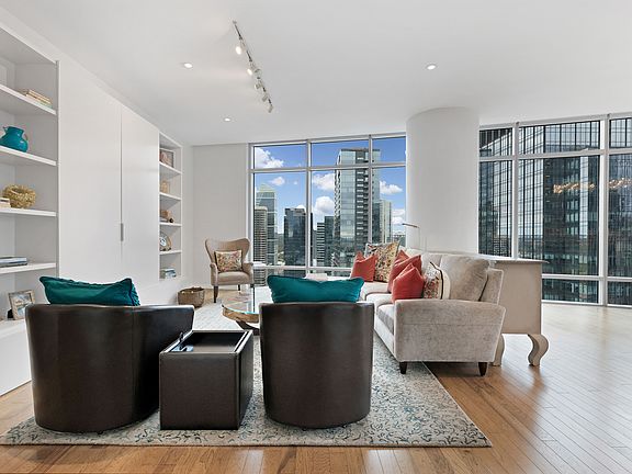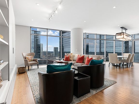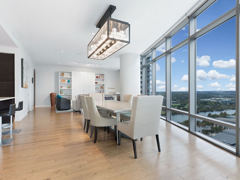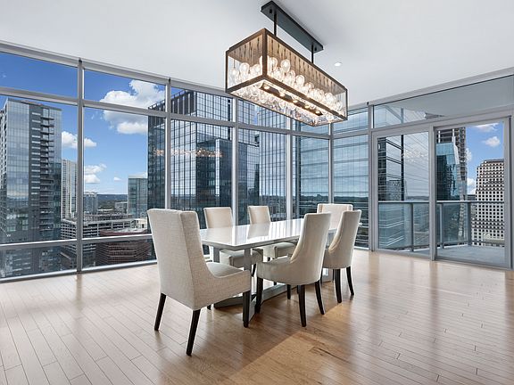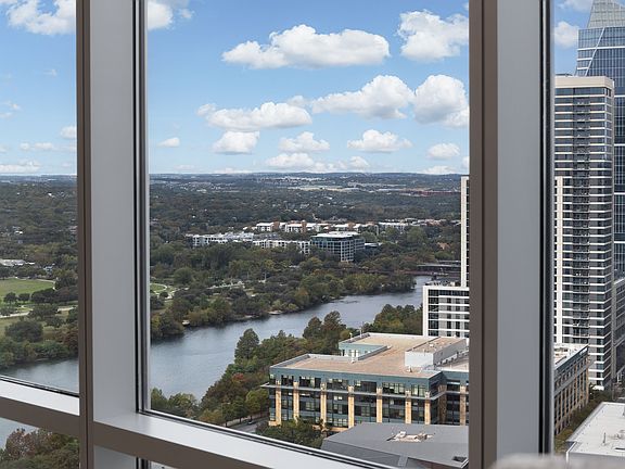 Discover urban elegance on the 25th story of the renowned Austonian. This sophisticated 2-bedroom, 2-bathroom condo, enhanced with a study and a balcony, offers a rare glimpse into Austin's splendor. Sweeping vistas of Lady Bird Lake, the city's dazzling skyline, and the Capitol. Indulge in the luminous ambiance provided by wall-to-wall windows in the seamlessly integrated kitchen, living, and dining spaces, extending out to a serene balcony. The chef's kitchen boasts premium stainless steel appliances, polished granite counters and backsplash, extensive cabinetry, and a stylish island with seating. Pristine hardwood flooring enriches every corner of this elegant home. The primary suite is a sanctuary of relaxation with incredible views, complete with a luxurious bathroom featuring a sumptuous tub, dual vanities, an expansive shower, and a walk-in closet with sophisticated storage solutions. The property also includes a large guest bedroom and a second bathroom. Conveniences such as an in-home laundry facility and a study with built-in shelving and desk space enhance the living experience. The Austonian is a beacon of luxury, offering its residents over 40,000 square feet of exclusive amenities. Enjoy access to a fitness center and pool on the 56th floor, boasting unrivaled city views, a personal spa room, pet care amenities, a cinema room, an elite wine cellar, and much more. This central Austin location places you in the midst of the Hike-and-Bike Trail, the Austin Public Library, premier shopping, and exceptional dining venues.