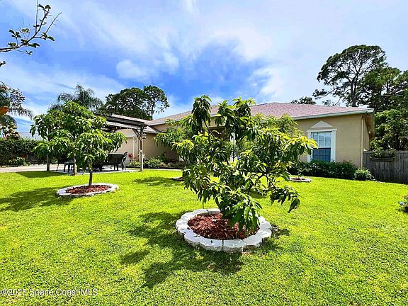 City Water, Brand-New Roof, gutters & AC! This beautifully upgraded home offers comfort, style, and functionality throughout. The welcoming family room features a built-in electric fireplace and a custom media wall with an impressive 85-inch TV—perfect for cozy nights or lively gatherings. Formal living and dining rooms provide an elegant setting for hosting guests, enhanced by stylish tile flooring and crown molding that add a cohesive, sophisticated touch. French doors open to a spacious screened-in porch, ideal for relaxing or entertaining outdoors. The kitchen is both warm and practical, showcasing rich maple cabinetry with crown accents, a breakfast bar, and a charming nook for casual meals. Master suite is a true retreat, complete with a generous walk-in closet and a luxurious en-suite bath featuring a garden tub and separate shower. Step outside to a gardener's paradise, where a pergola, exotic fruit trees, and privacy fencing create a serene and inviting backyard escape.