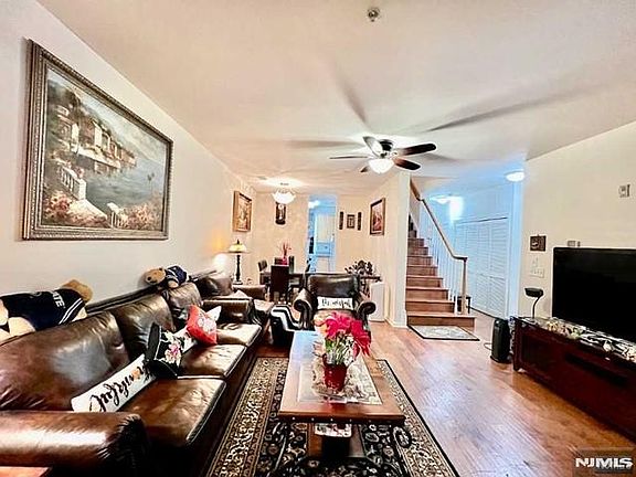 Young townhome 1225 SF on 2nd & 3rd floors in mint condition. Engineered floors throughout entire unit. Gettysburg model. Dishwasher, Washer, Dryer, Microwave & new SS refrigerator included. Water heater a few months old. Marble countertops & oak cabinets in kitchen. Both baths have ceramic-tiled walls & ceilings and Corian vanity tops. LR: 15'x14, DR: 10'x12', Kit: 10'x10'8, BRS: 14'10X12' & 15'8X14'6. 9' ceiling on 1st level. Ceiling fans in living room & 1st-level bedroom. 1 shared garage plus 1 Covered driveway parking space outside the Garage. Within 10-12 minute walk to Harrison Path Station. Near Rt. 280, Rt. 21, Turnpike, Parkway, NJPAC, Prudential Center, Red Bull Stadium, NJIT, Rutgers, etc. Convenient to shopping, dining, parks and schools. Flood insurance covered by condo HOA fees. Buyer to pay $250 move-in fee & $200 moving deposit required by condo association. Balconies in entire community cannot be opened or used. Access to gym/clubhouse/pool & shuttle to path requires annual membership enrollments every November with fees. Monthly HOA fee: $420.64 includes Flood Insurance. One domestic pet under 40 pounds is allowed. Offers need to be preapproved by a portfolio lender. The sofa set in the living room can stay.