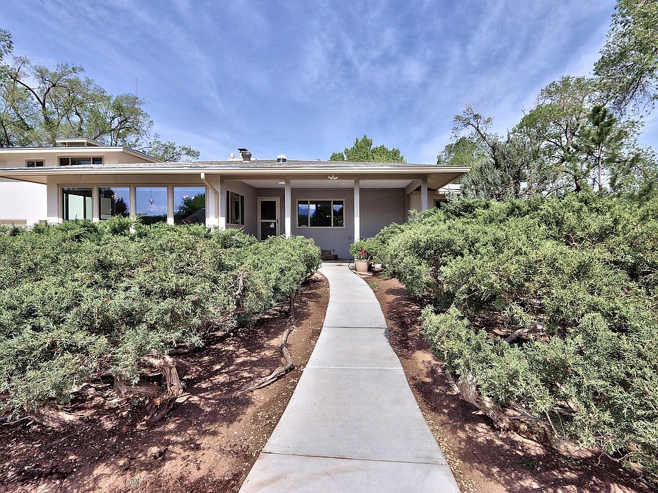 Wonderful Far North Valley property full of natural light and Southwestern charm. This enchanting home features two light filled east facing living areas, with a wall of windows looking at the Sandia Mountains. Enjoy viewing the Balloon fiesta mass ascension and dawn patrol from your living rooms, front patio and primary suite. Kitchen features a five burner gas cooktop, granite counter tops and tons of cabinets. East facing exposure is perfect for morning coffee or casual entertaining. There are 2 gates to the property with a private well house and large shed. Beautifully landscaped 1 acre with large shade trees and plenty of room for gardening. Enter home through a charming front patio into the living room and dining area. 4 bedrooms with 3 bathrooms make for room to grow